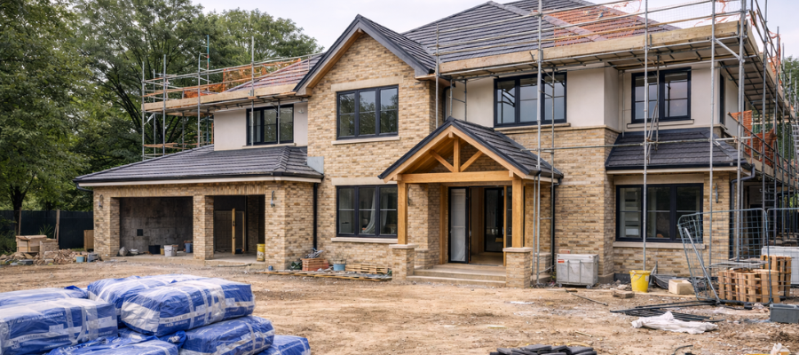 Roof construction and weatherproofing were completed to allow internal works to proceed without delay. Internal stages included first-fix services coordination, insulation, plastering, joinery, and final finishes across all living areas.