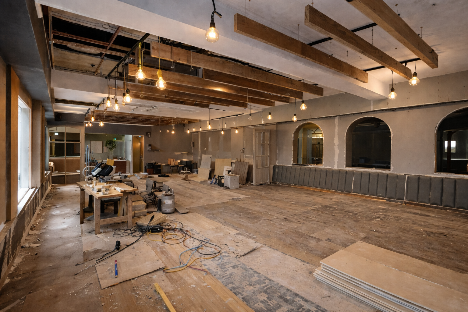 Works included formation of a fully operational commercial kitchen, installation of bespoke joinery elements, suspended ceilings, lighting integration and durable flooring systems suitable for hospitality environments.