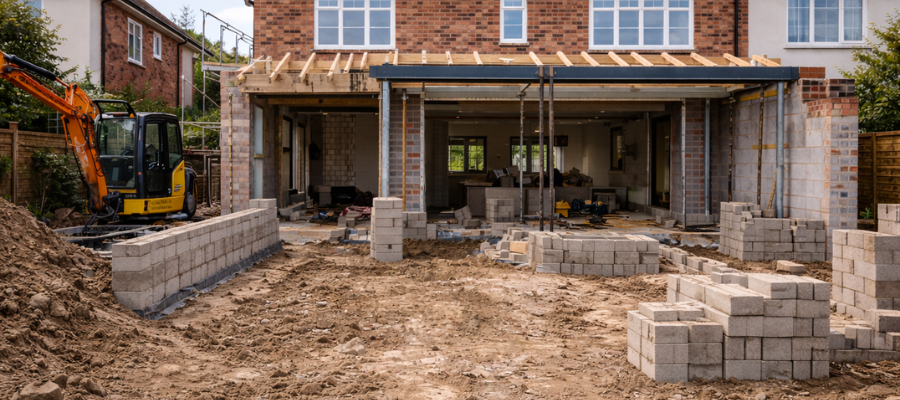 The project commenced with groundworks and foundation preparation to support both the side and rear extension footprints. Structural blockwork and brickwork were carried out in phases to ensure alignment and strength across the combined build areas.